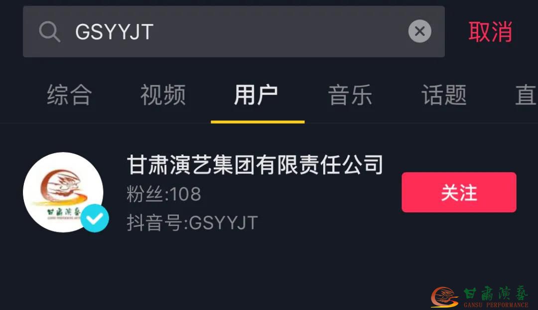 輸入“甘肅演藝集團(tuán)”或輸入抖音號(hào)“GSYYJT