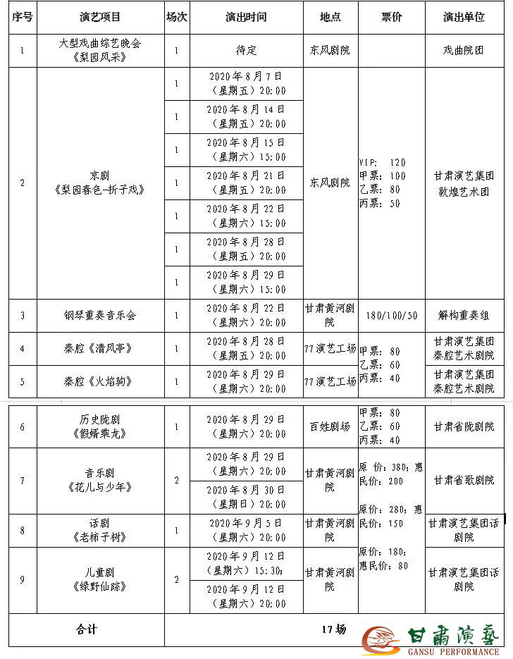 藝術(shù)節(jié)演出內(nèi)容涵蓋歌舞、民族交響樂、戲劇、曲藝、兒童劇、舞劇、話劇等多種藝術(shù)形式,共計演出100場。藝術(shù)節(jié)主場館設(shè)在蘭州市體育公園,每晚8時演出一場,由省直藝術(shù)院團(tuán)輪番上演大型綜藝晚會《如意甘肅》《敦煌樂舞》《魅力絲路·隴原情》、民族交響樂《國樂芬芳》《國風(fēng)》《黃河之聲》、主題樂舞《敦煌·絲路情》《魅力甘肅》《多彩甘肅·隴原風(fēng)》、音樂會《歲月留聲》、話劇《蘭州人家》、京劇《國韻京聲》、秦腔《大登殿》《鍘美案》《趙氏孤兒》,以及隴劇、秦腔折子戲?qū)龊颓嚲C合晚會《曲苑百戲》等經(jīng)典劇目,共計演出31場,每場一個主題。分劇場設(shè)在黃河劇院、東風(fēng)劇院、人民劇院、77演藝工場等演出場所,著力打造音樂會+戲曲+兒童?。拕〉难莩鲂问?,主要上演大型戲曲綜藝晚會《梨園風(fēng)采》、京劇《梨園春色-折子戲》、秦腔《清風(fēng)亭》《火焰駒》、隴劇《假婿乘龍》、音樂劇《花兒與少年》、話劇《老柿子樹》、兒童劇《綠野仙蹤》和鋼琴重奏音樂會等凸顯甘肅文化特色的精品劇目和體現(xiàn)出甘肅文化名片的品牌劇目。