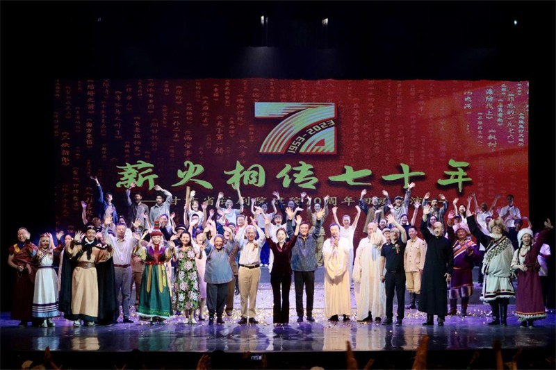 在全國(guó)50多家兄弟院團(tuán)和文藝行業(yè)協(xié)會(huì)發(fā)來的祝賀視頻與賀信,感受來自祖國(guó)各地戲劇人的誠(chéng)摯祝福中,《薪火相傳七十年》回顧展演徐徐拉開帷幕……《追夢(mèng)》以劇院現(xiàn)擁有的優(yōu)秀中青年演員為主力,將新一代“甘話人”青春的力量發(fā)揮到極致,在甘話的搖籃里孕育夢(mèng)想,奏響人生里最美的樂章。話劇《在康布爾草原》作為甘話自1953年成立以來的首部大戲,斬獲第一屆全國(guó)話劇會(huì)演劇本創(chuàng)作二等獎(jiǎng)、演出一等獎(jiǎng)、導(dǎo)演一等獎(jiǎng)、舞美設(shè)計(jì)一等獎(jiǎng),并光榮走進(jìn)中南海為毛澤東、劉少奇、周恩來、朱德等老一輩黨和國(guó)家領(lǐng)導(dǎo)人進(jìn)行演出,蜚聲全國(guó),甘肅話劇開啟了首度繁榮的局面。話劇《西安事變》是老一輩甘話人專門為紀(jì)念周恩來總理創(chuàng)作的一部戲,1978年首演就引起轟動(dòng),演出足跡從北京走遍大江南北,全國(guó)掀起了《西安事變》的演出熱潮,甘話又一次引起全國(guó)劇壇的注目。同一時(shí)期的話劇《岳飛》也聲名鵲起,甘肅話劇二度繁榮,并走向鼎盛時(shí)期。話劇《馬背菩提》榮獲原文化部第八屆文華獎(jiǎng)新劇目特別獎(jiǎng)、第八屆全國(guó)少數(shù)民族題材戲劇孔雀獎(jiǎng)劇本特別獎(jiǎng)、甘肅省首屆“五個(gè)一工程獎(jiǎng)”。朗誦《心中的舞臺(tái)》由老一輩“甘話人”傾情演繹,聲情并茂感人至深,婉轉(zhuǎn)鏗鏘地吟詠將整場(chǎng)演出的情感推向高潮!掌聲迭起,經(jīng)久不息——是感動(dòng),是共鳴,更是致敬……話劇《蘭州老街》《老柿子樹》是新一代甘話人在繼承甘話優(yōu)良傳統(tǒng)的基礎(chǔ)上,以年輕人視角開展創(chuàng)作的代表之作,呈現(xiàn)了濃郁的本土風(fēng)味和歷史文化,贏得觀眾極大的喜愛,甘話的舞臺(tái)再次紅火熱鬧起來,甘肅話劇再度繁榮。話劇《天下第一橋》把黃河中山鐵橋修建的歷史搬上舞臺(tái),獲文華獎(jiǎng)優(yōu)秀劇目獎(jiǎng)、文華編劇獎(jiǎng)、文華導(dǎo)演獎(jiǎng)、優(yōu)秀表演獎(jiǎng),入選國(guó)家舞臺(tái)藝術(shù)精品工程重點(diǎn)資助劇目,開創(chuàng)填補(bǔ)了甘肅省話劇歷史在此獎(jiǎng)項(xiàng)上零的空白,再次提升了甘肅省舞臺(tái)藝術(shù)在全國(guó)的知名度和美譽(yù)度,標(biāo)志著甘肅省話劇院已進(jìn)入國(guó)家精品劇目的行列。話劇《八步沙》更是作為甘肅省唯一一部戲劇作品晉京參加中宣部、文旅部、中國(guó)文聯(lián)“慶祝中國(guó)共產(chǎn)黨成立100周年優(yōu)秀舞臺(tái)藝術(shù)作品展演”、甘肅省委省政府文藝創(chuàng)作最高獎(jiǎng)——敦煌文藝獎(jiǎng)、入圍中國(guó)文化和旅游部第十七屆文華大獎(jiǎng)終評(píng)作品名單,參加京、津、冀承辦的第十三屆中國(guó)藝術(shù)節(jié)暨第十七屆“文華大獎(jiǎng)”展演,并榮獲第十七屆中國(guó)文化藝術(shù)政府獎(jiǎng)——文華大獎(jiǎng)提名劇目,承載世代“甘話人”文藝初心為甘肅本土文化再添光彩和榮耀。