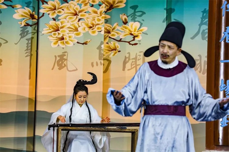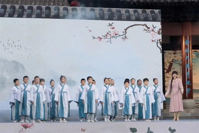 此次詩會別出心裁,以采詩官為主線,將整場詩會串珠成篇,次第鋪展。在采詩官的講述中,觀眾身臨其境開啟了一場水墨畫卷中的詩書樂舞旅程。學(xué)堂內(nèi),學(xué)童們吟誦起膾炙人口的《春曉》,老師正在講授朱自清的《春》,古今文學(xué)經(jīng)典恰如其分地詮釋著觀眾眼前這美麗的初春景象。身著漢唐服裝的女子在白水江碧波、油菜花田的舞臺呈現(xiàn)中翩翩起舞,古風(fēng)舞蹈《春江水暖》向觀眾展示出古代人們迎接春天的喜悅場景。獨(dú)立音樂人李建儐配合古樸的吉他吟唱《詩經(jīng)·秦風(fēng)·蒹葭》,3000多年前,秦隴大地文脈賡續(xù)灼灼光華的盛景躍然觀眾眼前?,F(xiàn)代詩朗誦《春天的謙詞》《碧口》,描摹出詩人亮子和包苞心目中的隴南春日景象,歌曲《心駐碧口》更是將人們對碧口古鎮(zhèn)的熱愛化作美妙的旋律在這片青山綠水間回蕩。情境詩朗誦《蜀道難》《鳳凰臺》將李白與杜甫的傳世名作生動演繹,展現(xiàn)出那個詩人輩出的年代隴南的自然景觀。當(dāng)舞臺上李太白、杜子美與采詩官跨越時空,共同吟誦起婦孺皆知的《將進(jìn)酒》,更是引起了全場共鳴,“五花馬,千金裘,呼兒將出換美酒,與爾同銷萬古愁”的合誦聲將人們帶到了群星璀璨的盛唐。