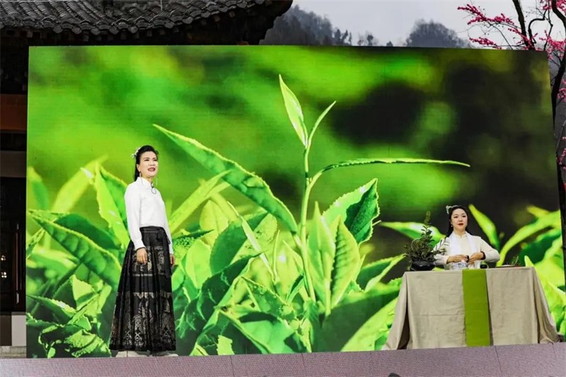 采茶時節(jié),春天清甜的氣息凝結(jié)在新茶的嫩葉上,繁忙而喜悅的采茶姑娘在山間擷取著春的饋贈,當(dāng)?shù)匚乃嚬ぷ髡邘淼摹恫刹栉琛穼㈦]南春茶采集景象展現(xiàn)在舞臺上。元稹《一七令·茶》、賀朝舉《在茶園里喝茶》、嘉陽拉姆《裕河問茶》,古今詩人的詩情畫意和茶藝師讓觀眾領(lǐng)略到隴上江南的茶香。隴南民歌《高山謠》、鄧文德的現(xiàn)代詩《隴南春曉》,用歌唱與詩詞讓人們穿越三千年詩歌長河,享受這春意盎然的人間最美二月天。