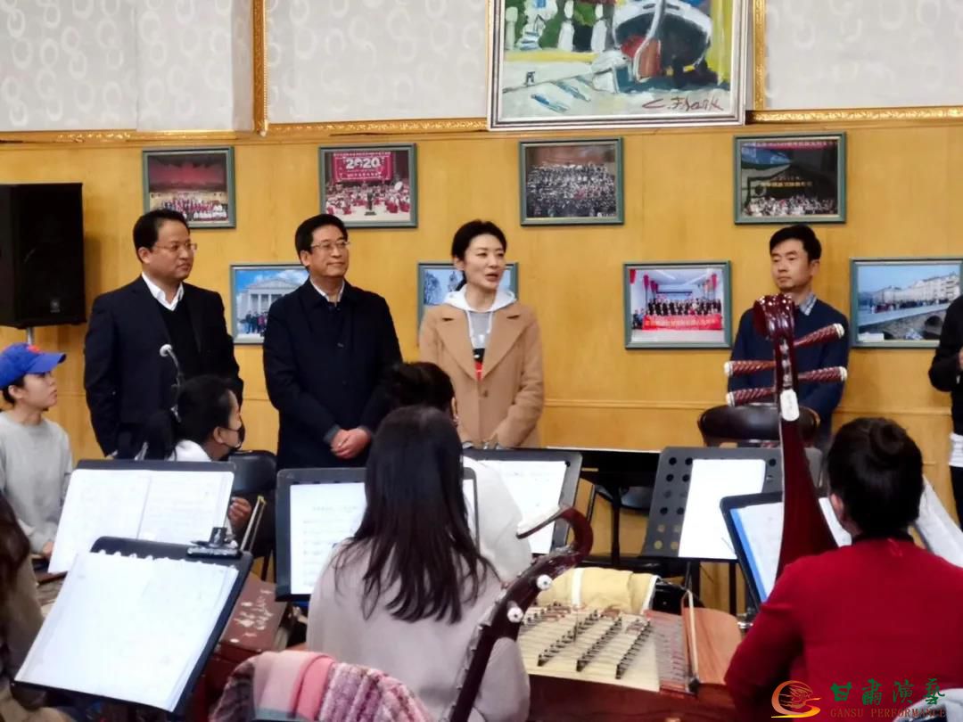周濤一行首先來到民族樂團排練廳,甘肅演藝集團黨委書記、董事長陳其銀及歌舞劇院院長李金江向周濤介紹民族樂團的藝術(shù)生產(chǎn)情況,并觀看樂團及唱隊聯(lián)排舞劇《絲路花雨》經(jīng)典音樂片段,周濤對排練給予高度評價,動情的說:“在我中學時期第一次觀看《絲路花雨》電影版時就被這一全新的藝術(shù)表演所震撼,剛剛音樂一響我一下就熱淚盈眶,難以想象在四十多年前,前輩們是有多大的創(chuàng)新精神才能在改革開放初期創(chuàng)作出這樣難能可貴的集多民族元素于一體的藝術(shù)作品,在我看來《絲路花雨》就是一座藝術(shù)豐碑,各位能夠演唱和演奏是一種榮譽,大家排練的濃厚藝術(shù)氛圍也讓我肅然起敬!