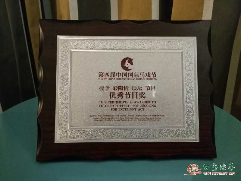 2017年11月22日至25日,甘肅省雜技團(tuán)情景雜技節(jié)目《彩陶情——頂壇》在珠海參加第四屆中國(guó)國(guó)際馬戲藝術(shù)節(jié),榮獲“優(yōu)秀節(jié)目獎(jiǎng)”。這是西北五省雜技團(tuán)在“中國(guó)國(guó)際馬戲藝術(shù)節(jié)”上的首次亮相,并獲得“優(yōu)秀節(jié)目獎(jiǎng)”。