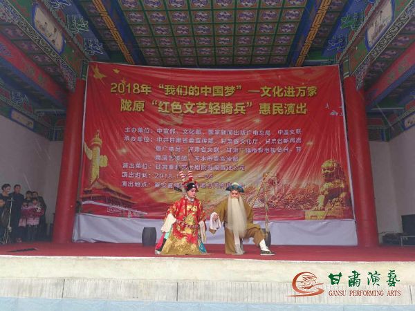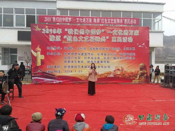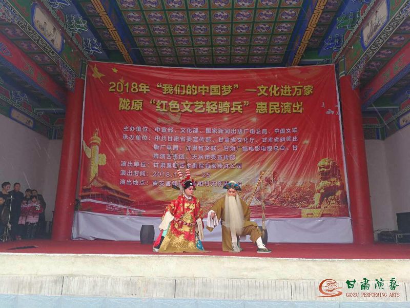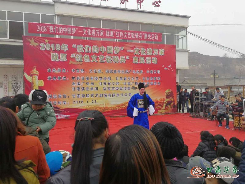 為深入學(xué)習(xí)貫徹黨的十九大精神和習(xí)近平總書記對(duì)烏蘭牧騎“紅色文藝輕騎兵”重要指示精神,落實(shí)中宣傳部關(guān)于2018年元旦春節(jié)期間廣泛開展“我們的中國夢(mèng)”——文化進(jìn)萬家活動(dòng)的要求,2018年1月22日至26日,甘肅秦腔藝術(shù)劇院的50余名演職人員冒著凜冽的寒風(fēng)和大雪,赴西和縣蘇合鄉(xiāng)張家河村、石峽鎮(zhèn)石峽村及秦安縣郭嘉鎮(zhèn)寺開展“我們的中國夢(mèng)”文化進(jìn)萬家暨隴原“紅色文藝輕騎兵”惠民演出活動(dòng)。